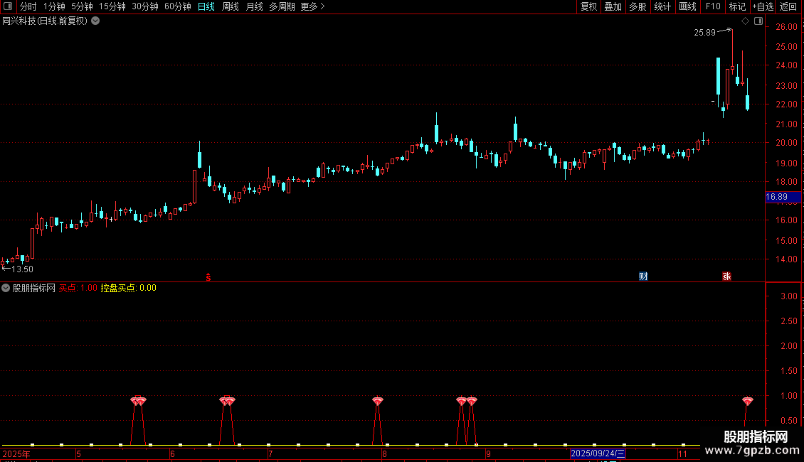2. 控盘买点:在基础买点出现后,进一步要求资金呈现“有庄控盘”的流入状态,并且股价上穿短期趋势线。这是更强烈的买入信号,会在副图以特殊的蓝色柱状和黄色文字标注。