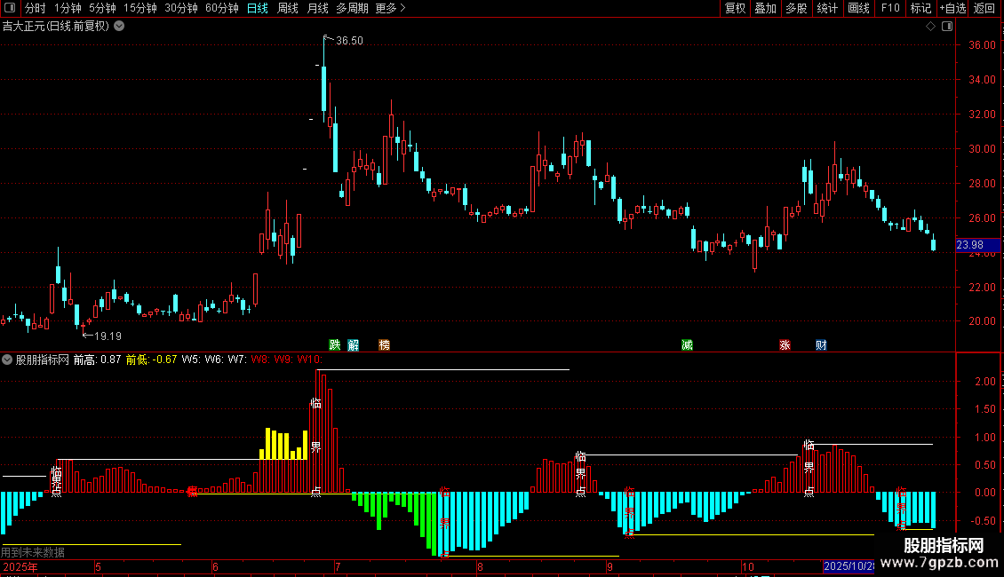 观察MACD柱状线与“前高”、“前低”趋势线的相对位置。当红色柱体突破白色“前高”线时,可能预示上涨动能增强;当青色柱体跌破黄色“前低”线时,可能预示下跌动能加强。同时关注“临”、“界”、“点”的文字提示位置,它们标识了潜在的阻力或支撑临界区域。