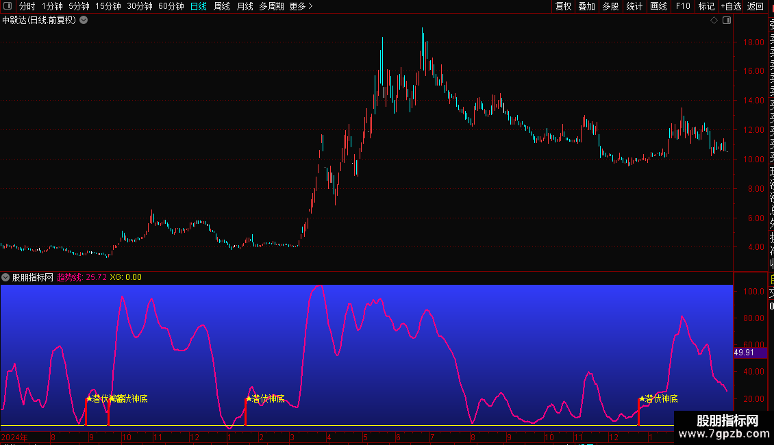 买入时机:当副图出现红色柱线并显示“★潜伏神底”字样,或者选股公式发出信号时,代表股价处于低位且趋势开始反转,适合激进者潜伏或稳健者观察。