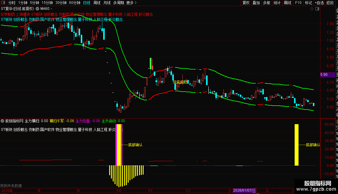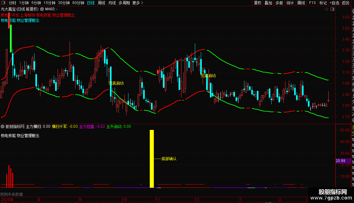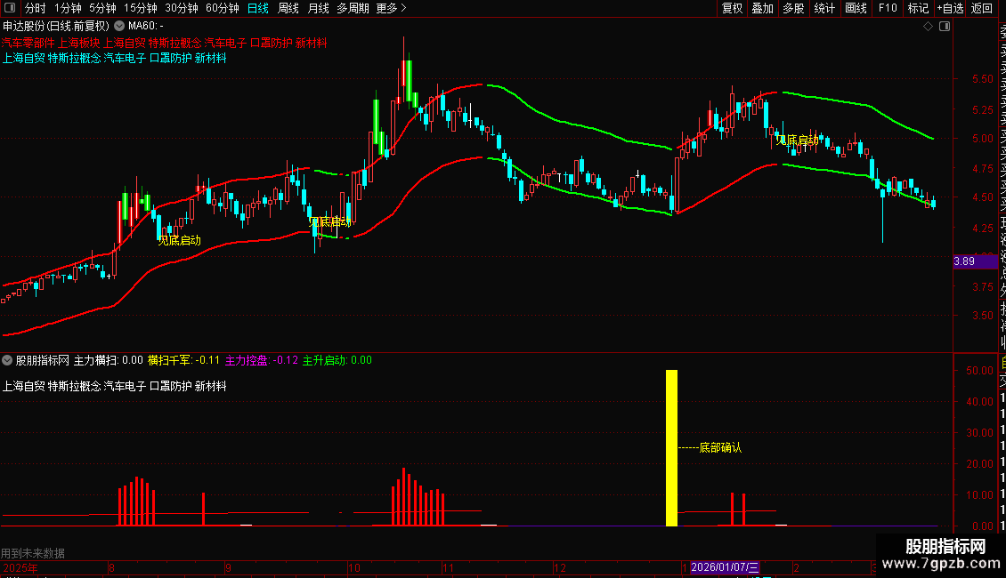 主图指标标注板块信息、支撑压力线,用彩色K线高亮强势/弱势异动,出现“见底启动”提示代表主力低位蓄力;