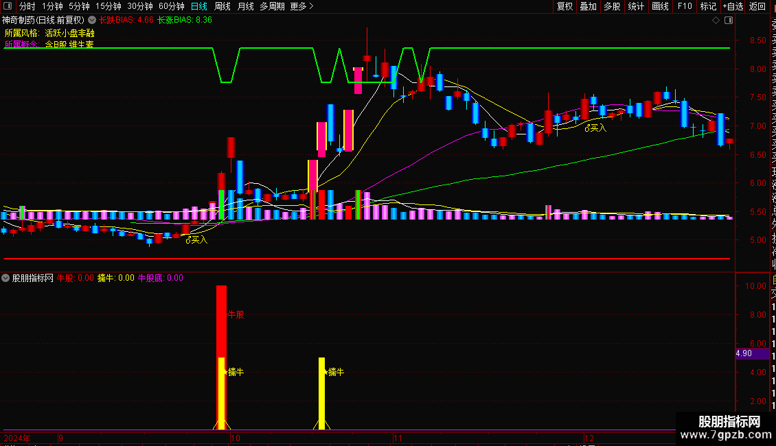 短涨BIAS:=IF(BIAS11>=6,天,天+0.6),COLORBLACK,LINETHICK2;