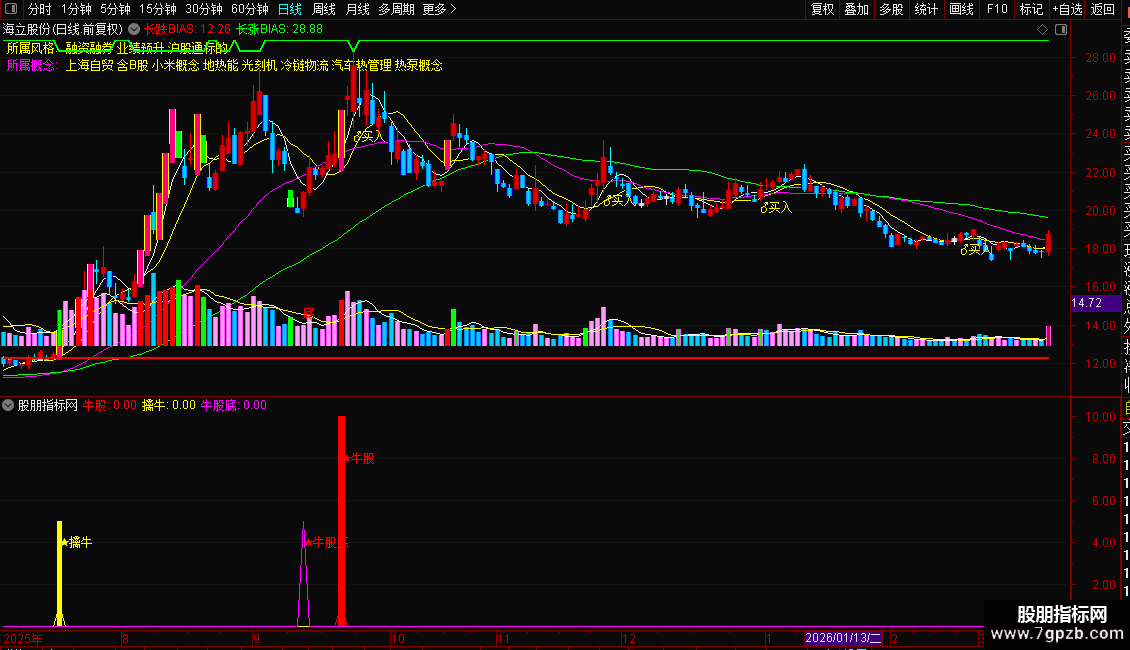 长跌BIAS:IF(BIAS13<=-16,0.6+地,地),COLORRED,LINETHICK2;
