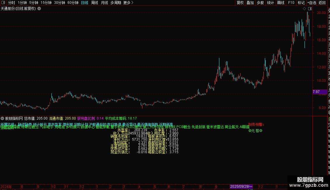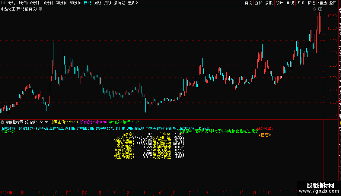 指标是一个全面的基本面信息面板,直接在K线图上展示个股的所属板块、主营业务、市值规模及获利盘比例。核心功能是进行财务健康度诊断,通过计算Z值模型自动预警财务风险(重警、轻警或无警)。同时,它详细列出了市盈率、毛利率、净利润增长率、每股现金流等关键估值与成长指标。操作策略上,投资者可利用此面板快速筛选低估值、高成长且财务安全的标的,避开有财务预警的风险股,辅助价值投资决策。