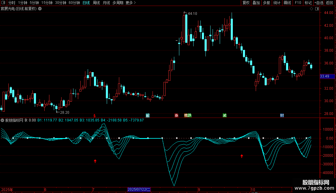 指标包含能量线B1至B5,以及基于能量线形态和强度的筛选条件。信号以图标形式在副图显示。