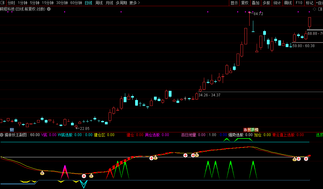 看见黄/紫色柱子开始关注,出现红色信号可以试买,出现洋红色持有或加仓,出现绿色就跑。