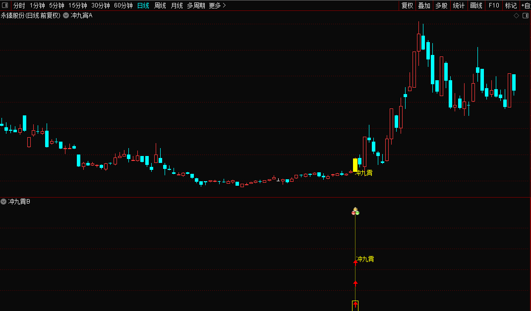 主图公式黄色柱状线及"冲九霄"文字信号。