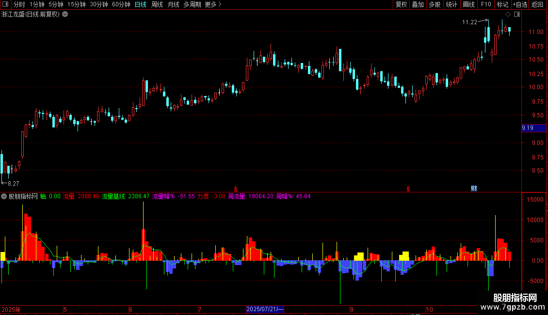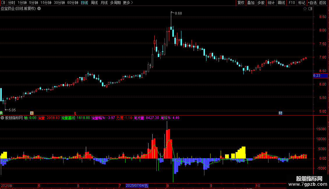 - 观察“流量”柱状图与“流量基线”的关系,判断资金趋势。