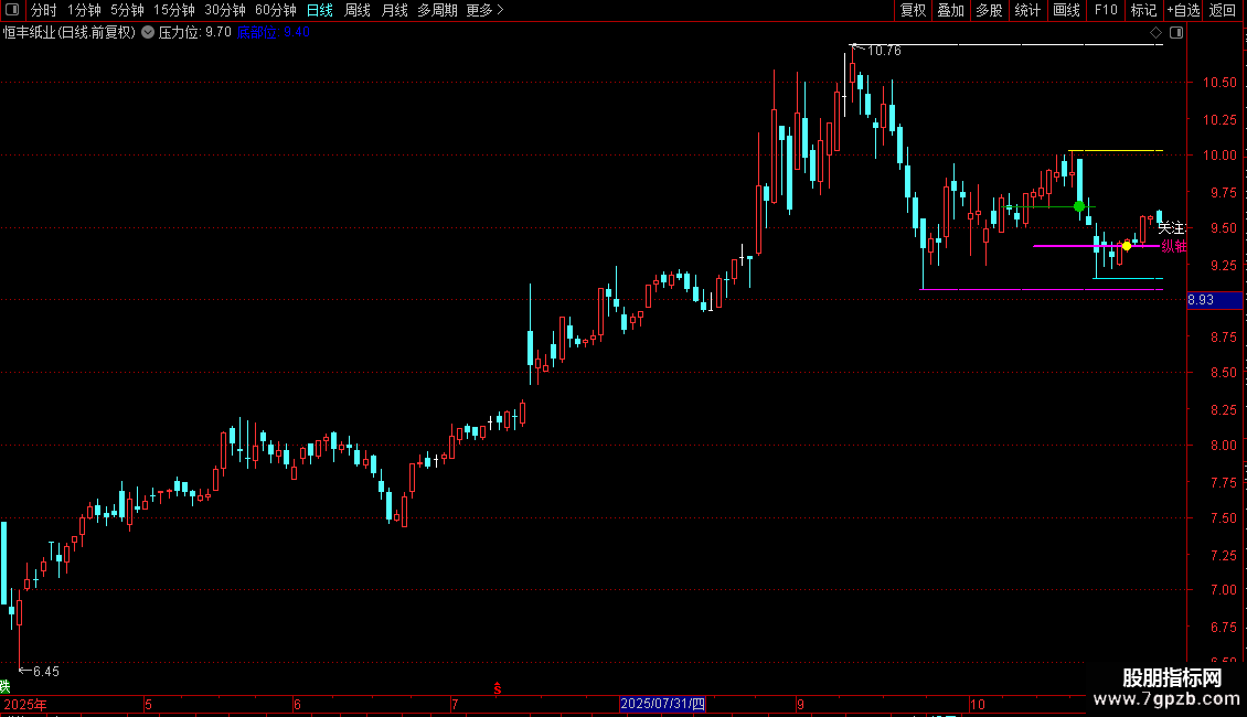 5. 关键价位标记:在自动识别出的显著高点和低点位置,用不同颜色的粗横线进行标记。