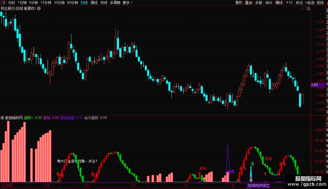 2. 进场时机:指标显示“进场”红色文字+向上箭头,且“趋势1”由绿转红时,为潜伏良机;“有大资金进场迹象”提示资金异动,需跟踪量能是否持续放大。