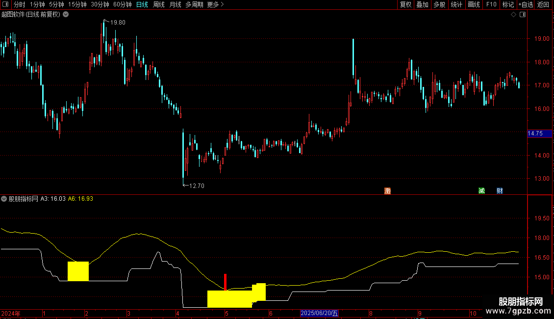 基础条件预警:当仅满足MACD“基础”条件时,用黄色柱状线进行标注,提示潜在关注位置。