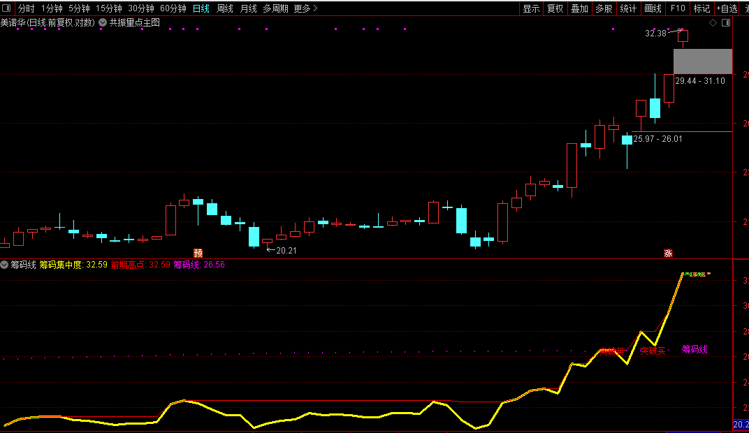 筹码集中和前高线双线合一同时上穿筹码线就是最好的买点,同时结合风口,胜率翻倍。