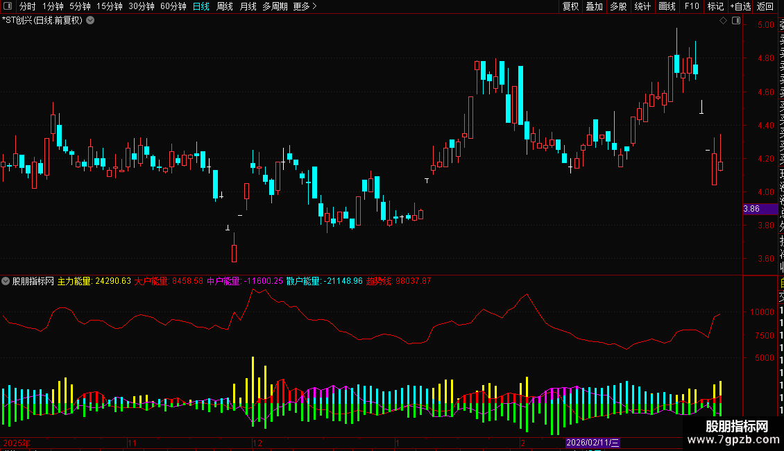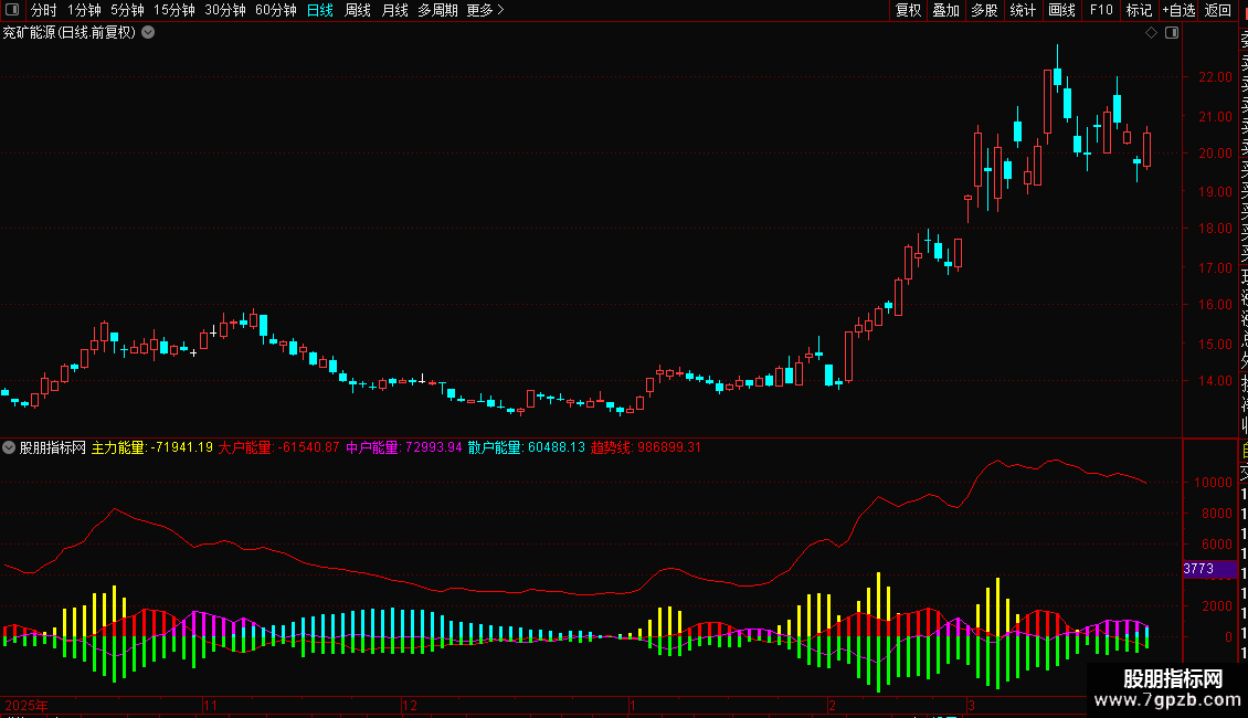 STICKLINE(中户能量>=0 AND 中户能量< REF(中户能量,1),2,2+中户能量,1/3,0),COLORMAGENTA;