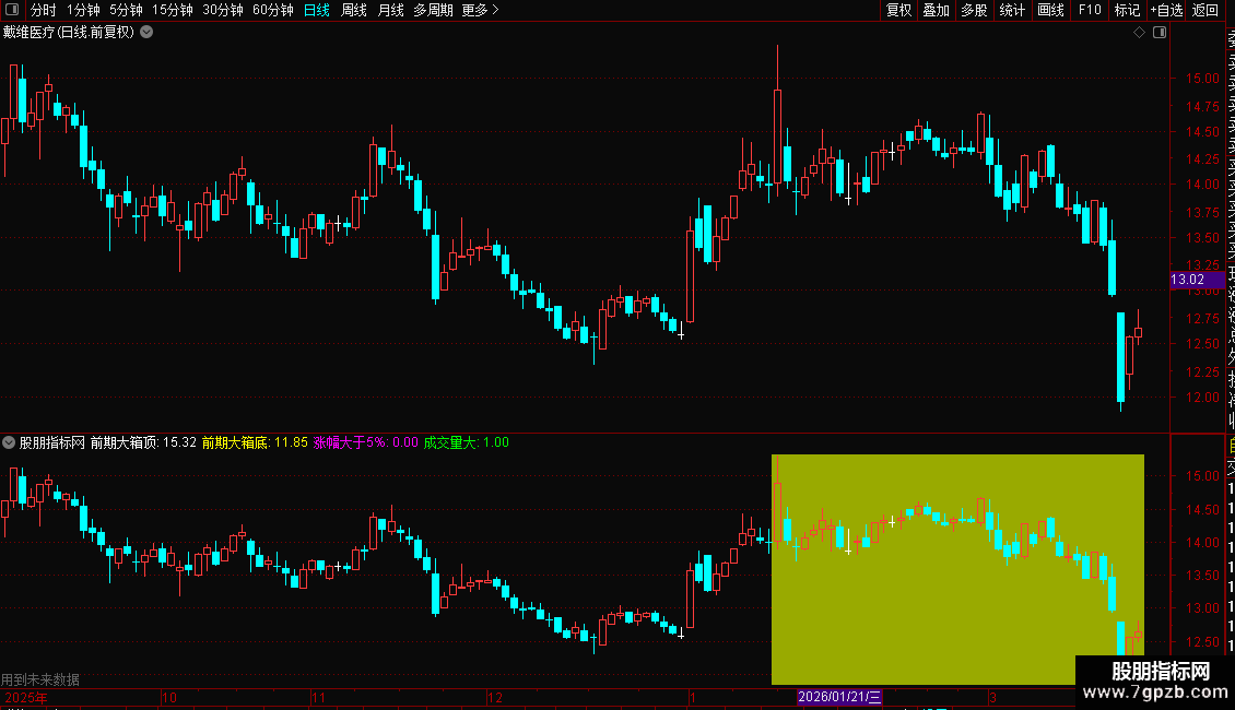 1. 绘制箱体:自动识别近期的高低点,形成一个箱体区间,并用色带标注。
