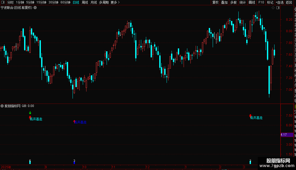 DRAWTEXT(QB AND 低开高走信号,L*0.90,'双信号'),COLORRED;