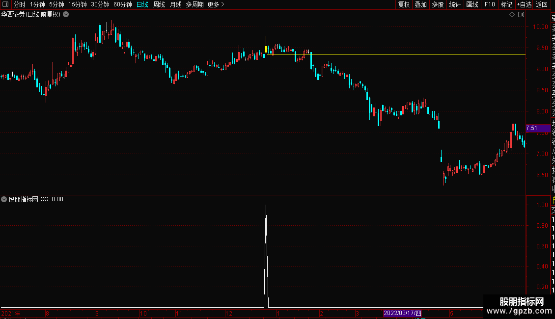 STICKLINE(XGDAY>0,REF(L,XGDAY),REF(L,XGDAY),3,0),COLORYELLOW;