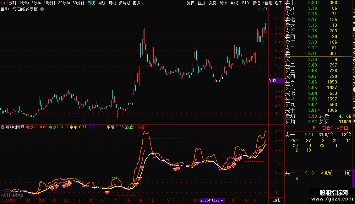 指标包含多条均线、通道线及支撑阻力线,并配有特定信号标记。