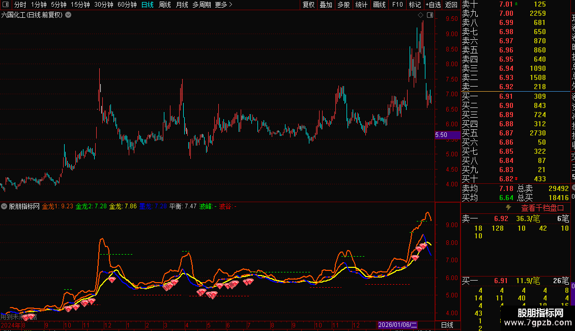 - 墨龙:收盘价的LL日指数移动平均线,其上涨部分用不同颜色突出显示。