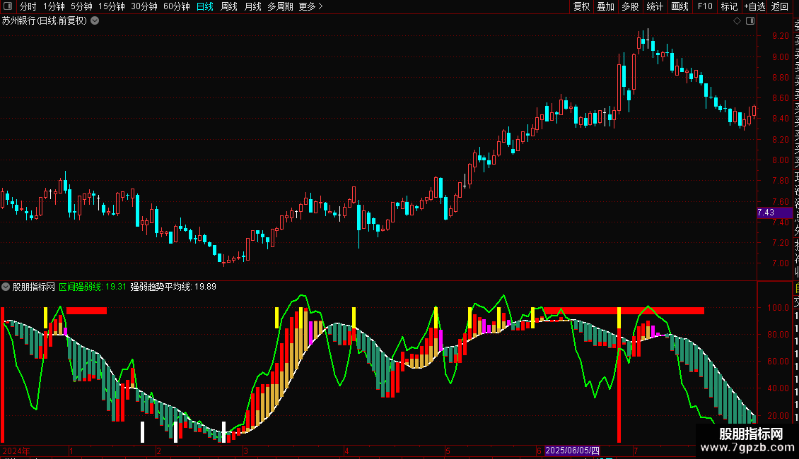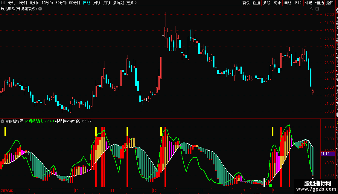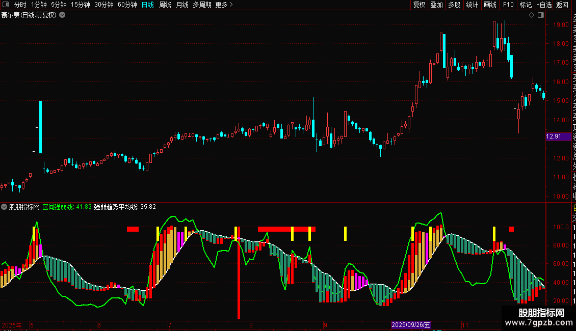 2、趋势确认:通过“区间强弱线”(绿色)与“强弱趋势平均线”(白色)的交叉及颜色变化,识别趋势强弱转折点;黄色柱状线标记5日内首次出现的高点突破信号。