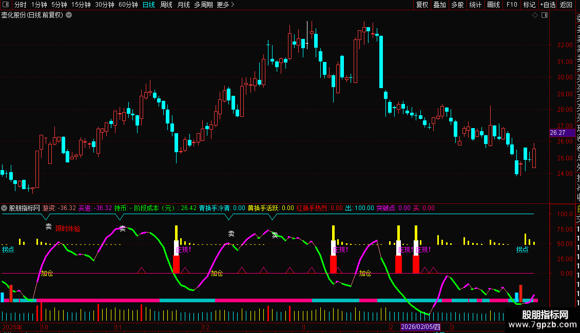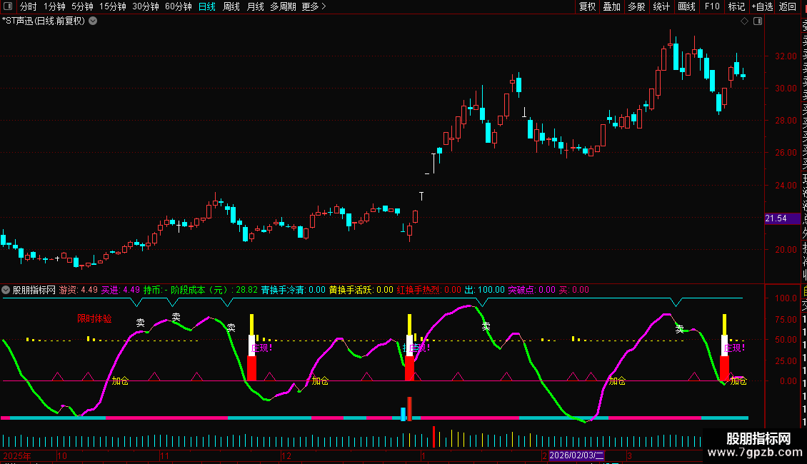 用法: 粉柱持股,蓝柱观望; 游资上扬(洋红粗线)买入,下穿(绿线)持币; “拐点”“加仓”“庄现!”提示关键机会,配合换手≥7%更有效; MM超80出“卖”字,警惕回调。