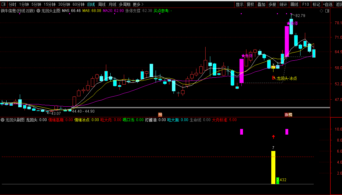 本指标为龙头股龙回头战法副图指标,属于实用股票公式指标,主要用于捕捉强势龙头股断板后的低吸买点,适配通达信软件,仅建议在日线周期使用。