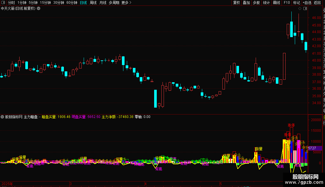 功能:指标的核心是将每日的成交量,根据开盘价、收盘价、最高价、最低价的关系,拆解为不同性质的“买盘”和“卖盘”,并用不同颜色的柱状图直观展示。同时,它还会在图上标注“倍量”、“涨停”、“背离”、“多头”等关键市场状态,帮助快速识别盘面特征。