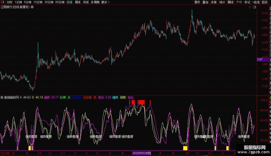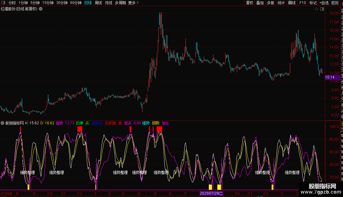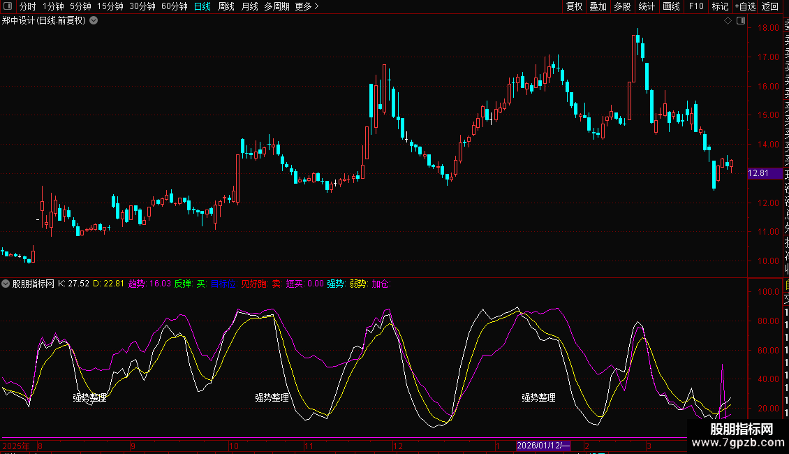 4. 辅助分析:包含类似KDJ的K、D线,以及“强势整理”等状态提示,用于辅助验证其他信号。