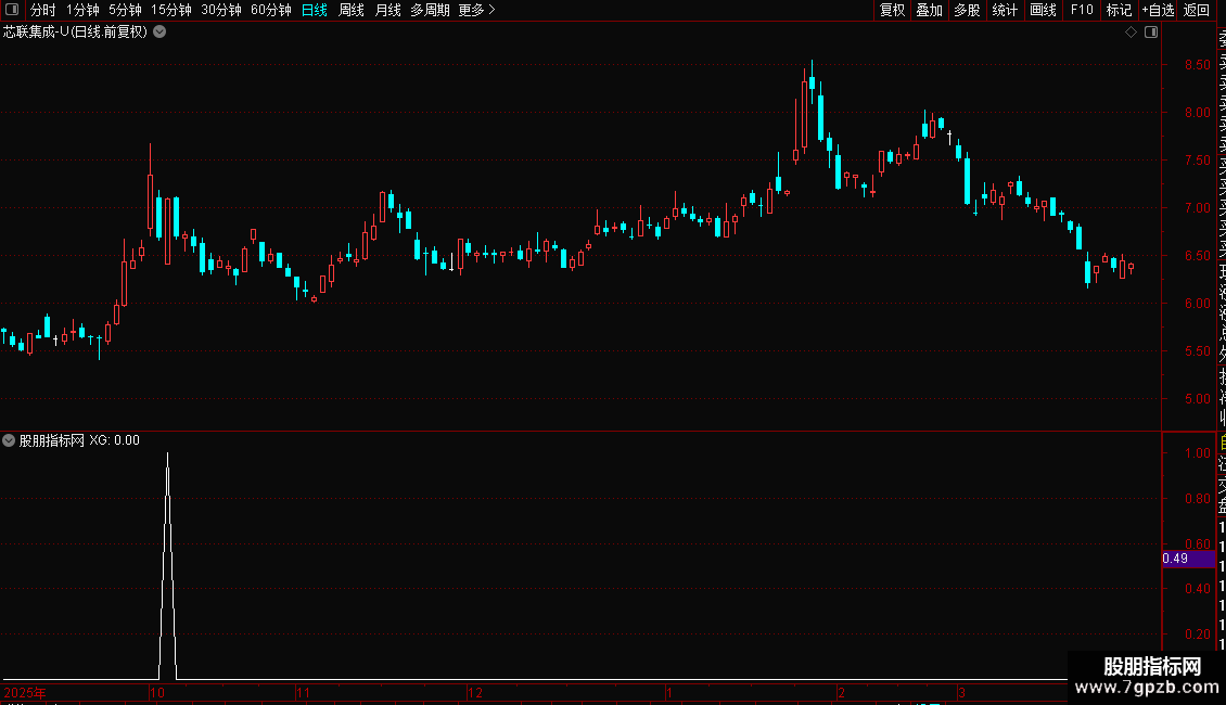 VARG78:=BARSLAST(VARG75)<=7 AND VARG74 AND VARG77 AND COUNT(VARG74,BARSLAST(VARG75))=1 AND NOT(HIGH=LOW) AND REF(NOT(HIGH=LOW),BARSLAST(VARG75))=1;
