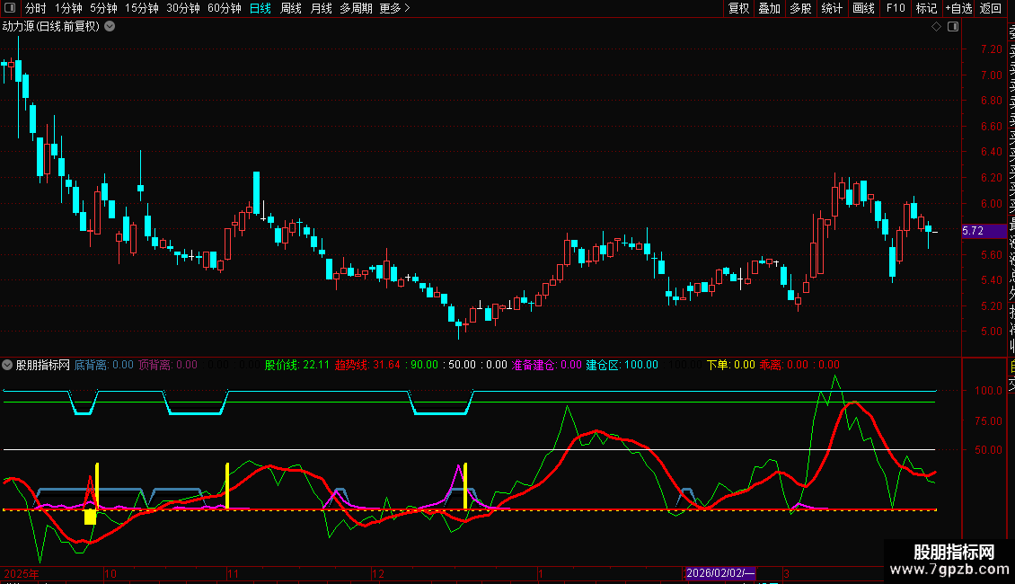 建仓区: IF((VARO7< 10),80,100) ,COLORFFFF00,LINETHICK3;