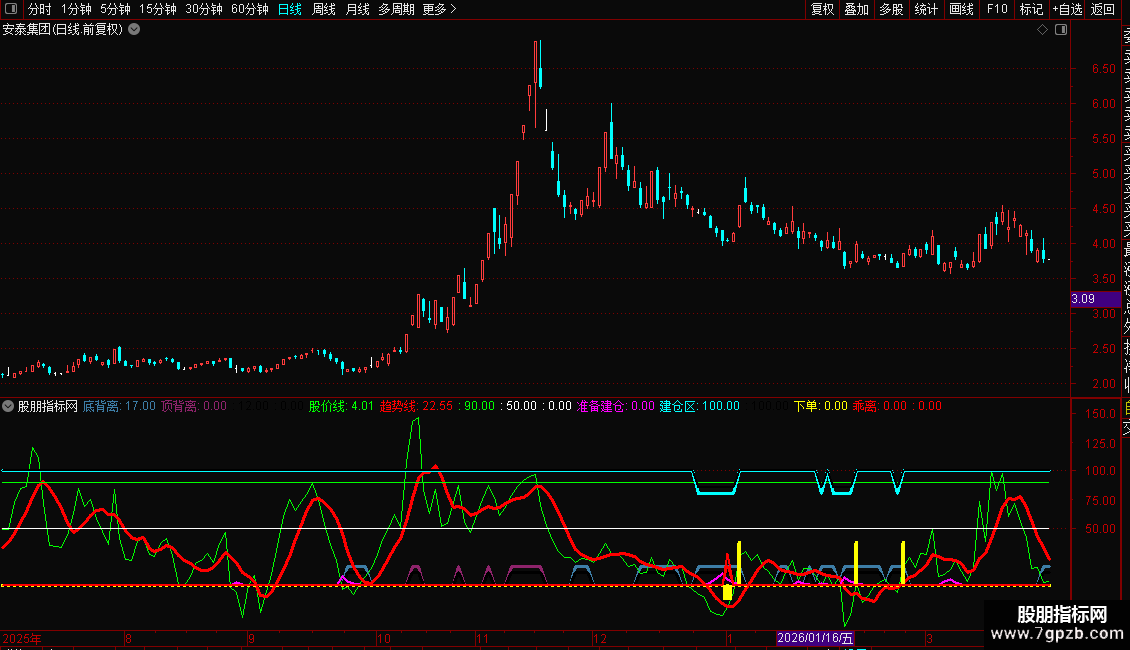 底背离:IF(MN< -4 ,17,0),COLORA67D3D,LINETHICK3;