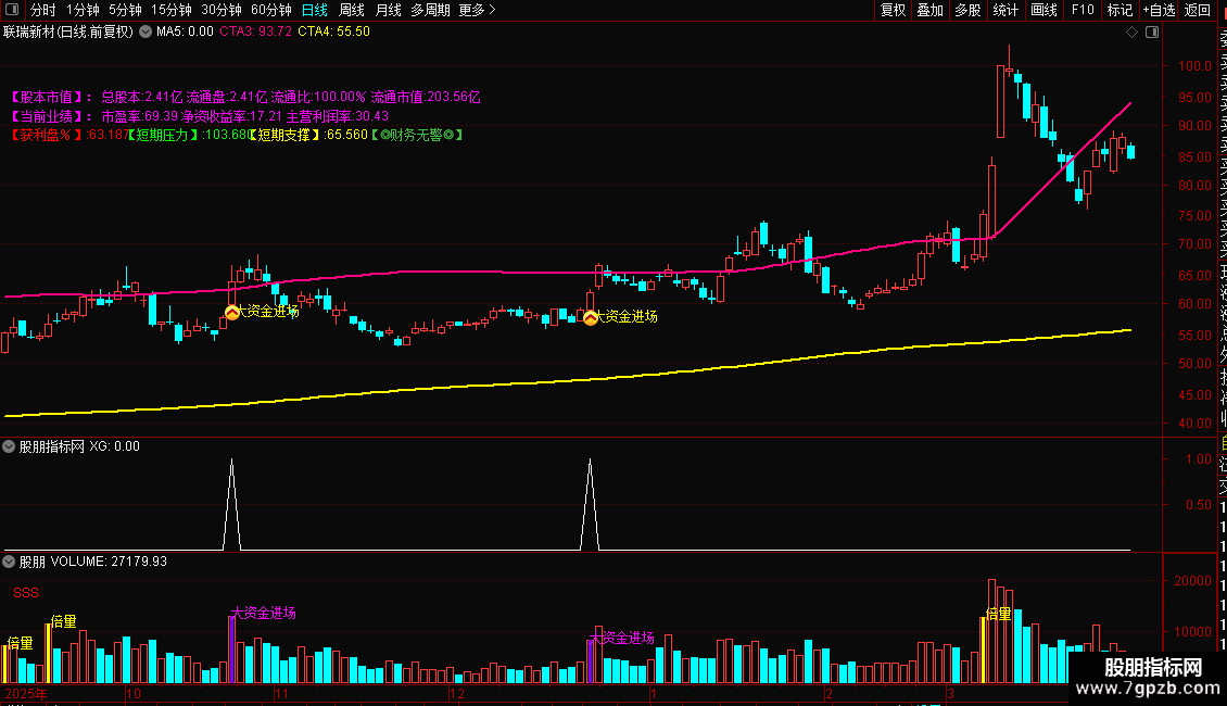 本指标为通达信主图综合指标,集资金信号、趋势突破、财务分析、成本支撑压力、股本市值五大功能于一体,直观展示个股安全度、进场机会与关键价位。