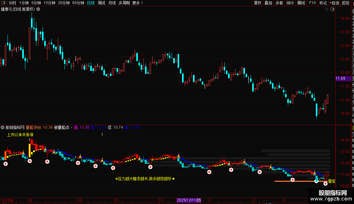 1. 成交量压力带:将近期价格区间等分为十个层级,根据各层累积成交量绘制横向暗色条带。条带越长代表该价位成交量堆积形成的压力或支撑越强。