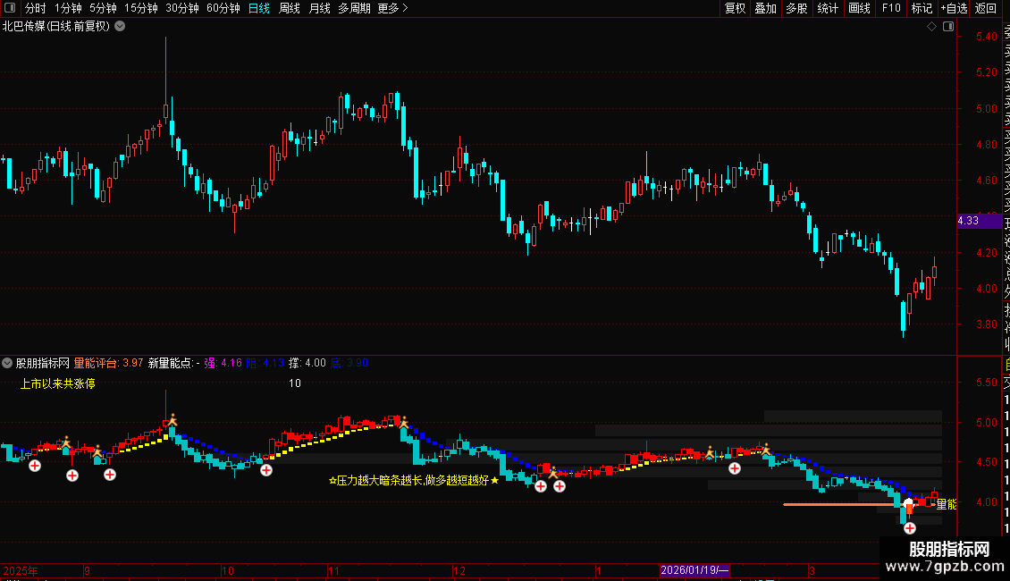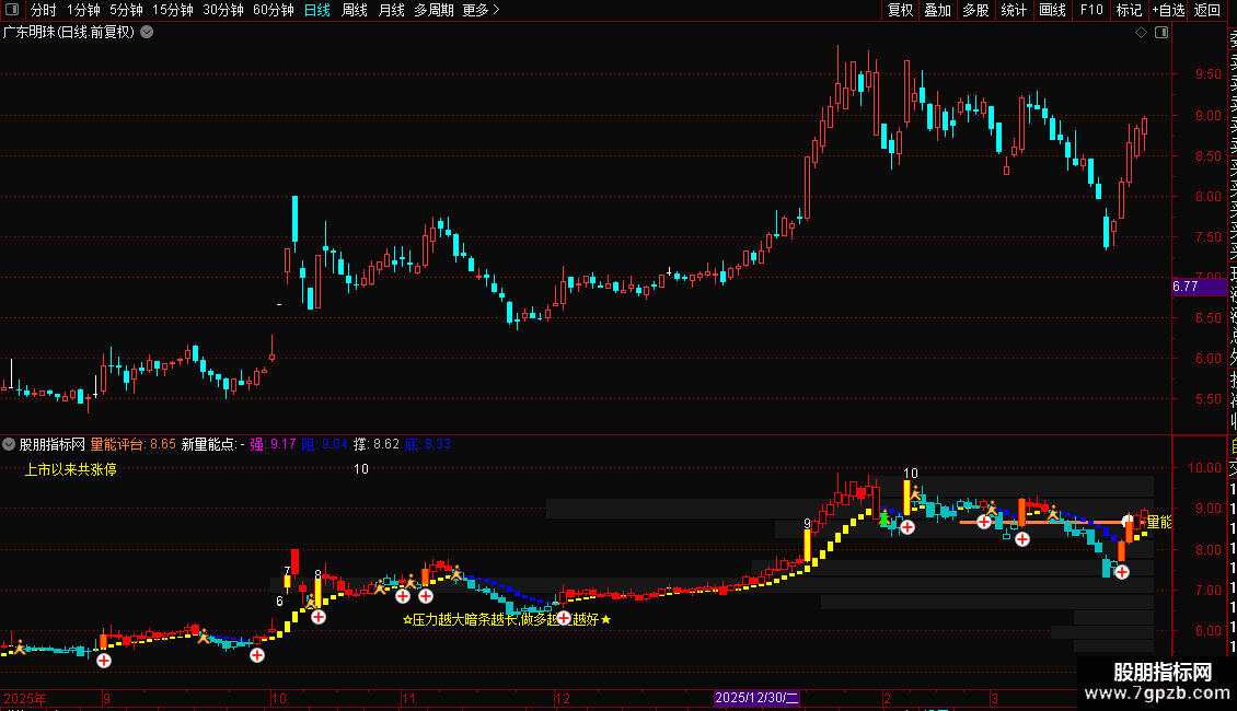 使用要点:指标综合了成交量分布、趋势方向、多空动能和关键价位,适用于分析个股的支撑阻力强度、短期多空态势以及异动点(如涨跌停)。观察时,重点关注成交量压力带的长度变化、量能平台与价格的互动关系,以及K线着色与多空区域的一致性。