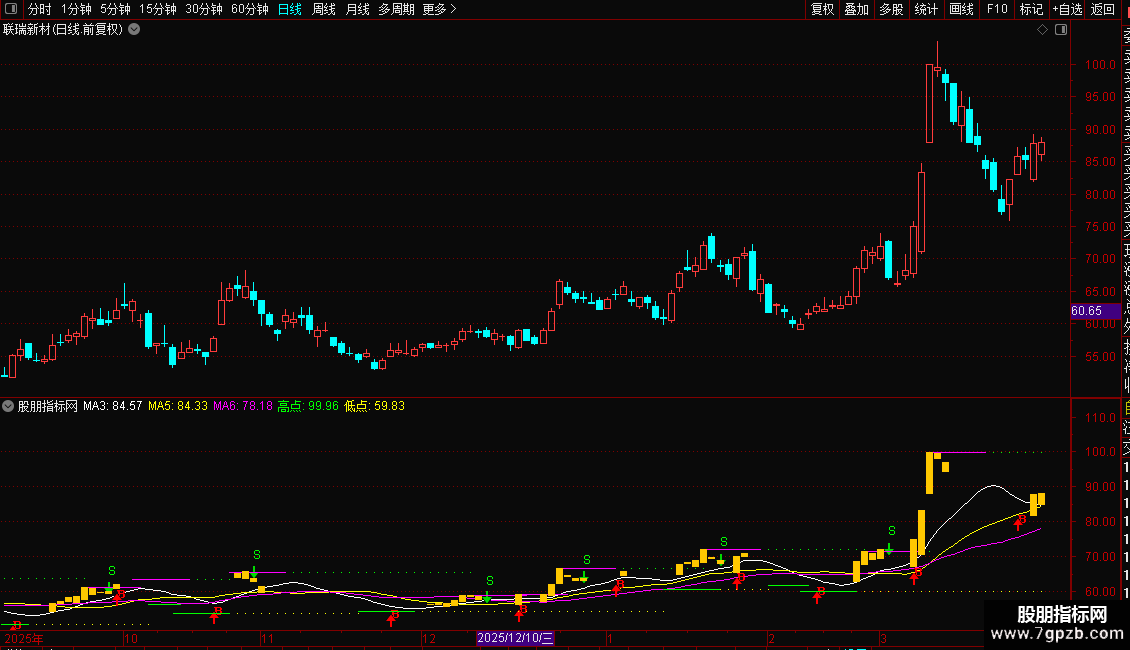 6. 立桩量高低点:标识最近13日周期内的显著高点和低点(“桩”),并用紫色和绿色柱线突出最近6个周期内形成的高低点。当股价突破近期高点时,给出“突破”信号。
