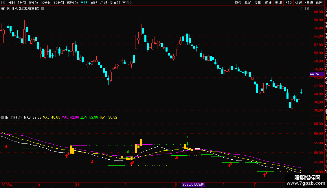 2. 买入信号 (B):当短期均线(3日)止跌回升,且股价站上7日均线时触发。在K线下方用红色“B”字和图标标记。