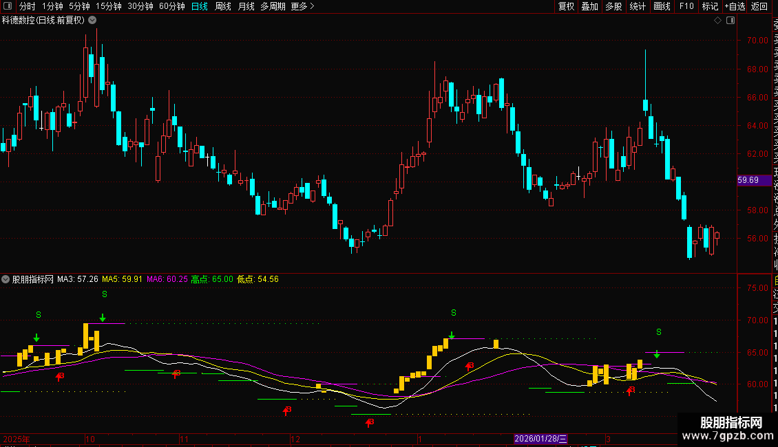 3. 卖出信号 (S):结合两种逻辑触发:一是“多头力量”显著强于“空头力量”且随机指标(KD)死叉;二是短期均线(3日)见顶回落且K值处于高位。在K线上方用绿色“S”字和图标标记。