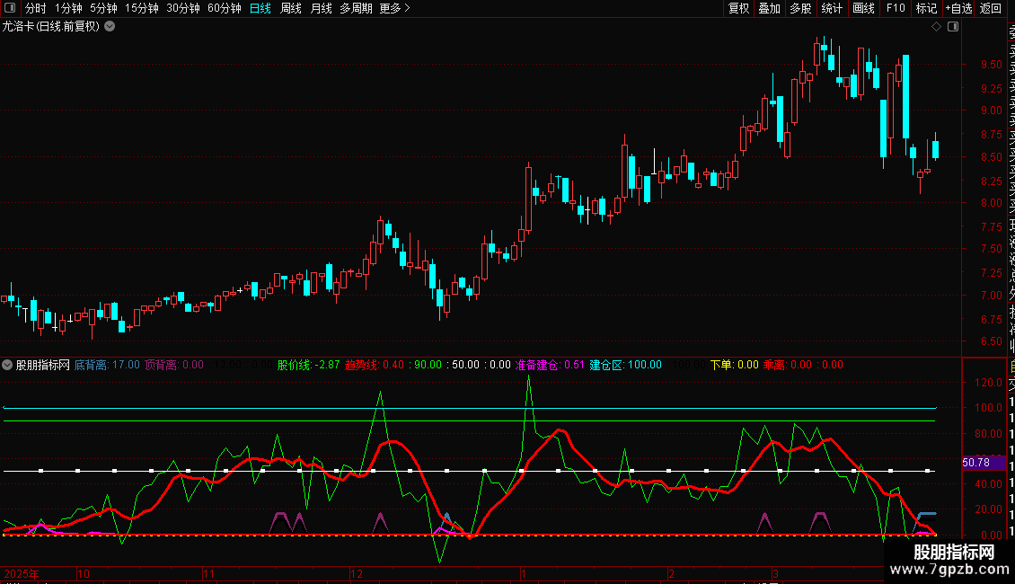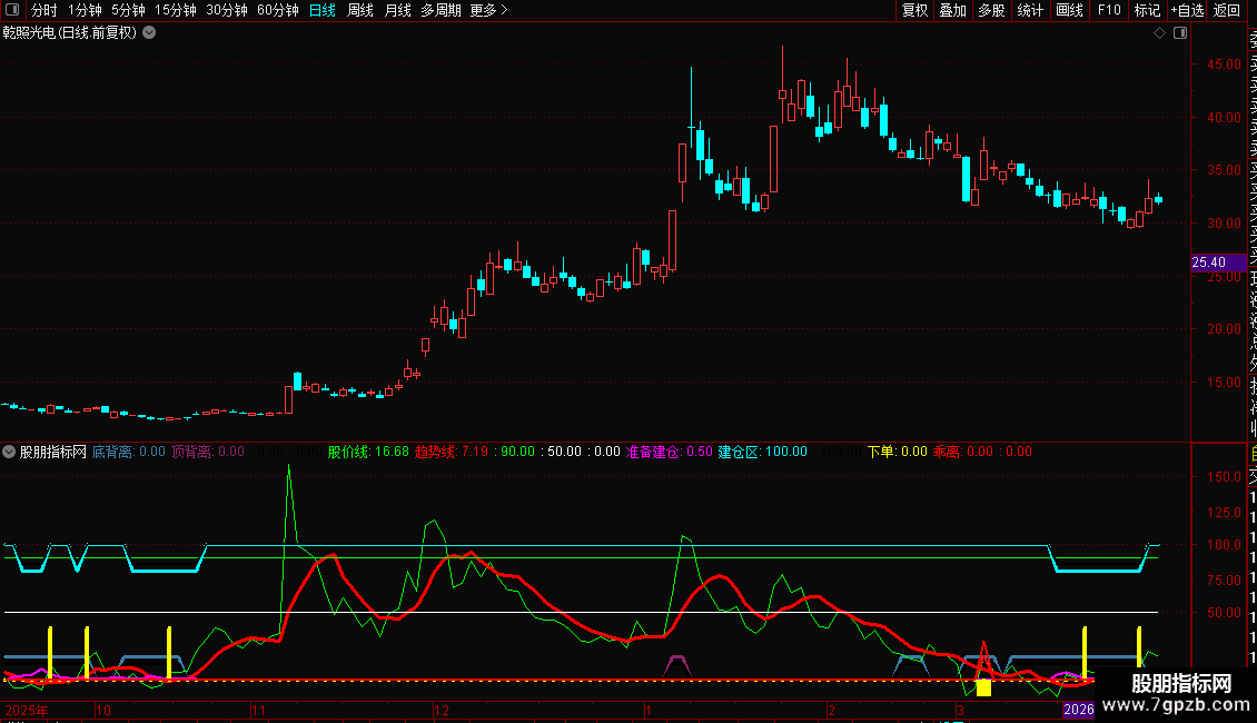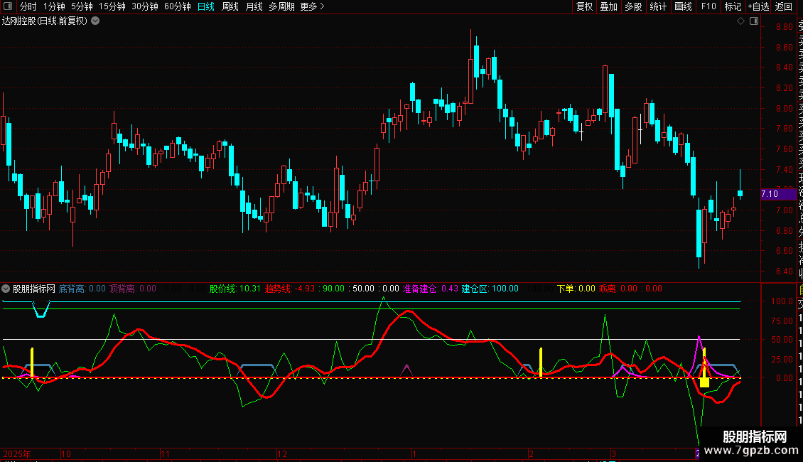 当副图中出现“低买”、“下单!”等文字提示,或出现相应的红色、黄色信号柱时,可视为一个潜在的买入信号。