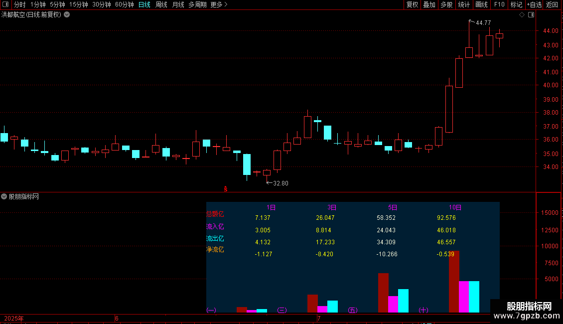 DRAWTEXT(CURRBARSCOUNT=30,画*0.67,'流出亿'),COLORCYAN;