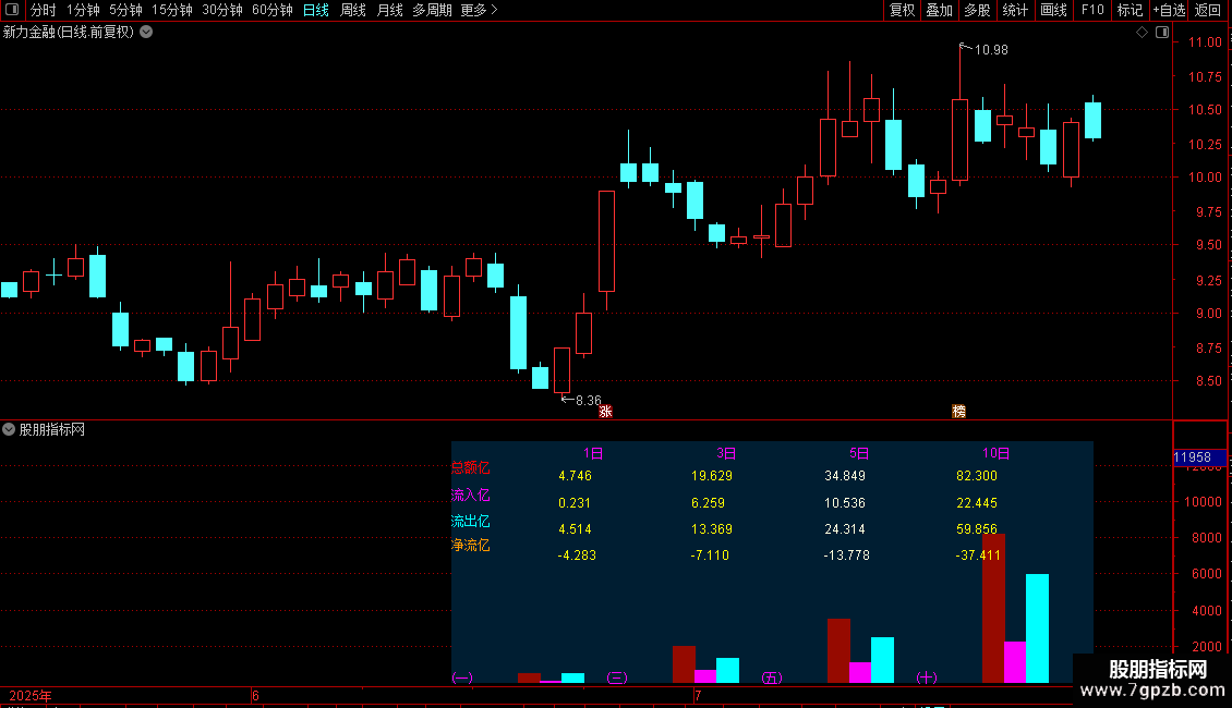 通达信资金图表副图指标 一、三、五、十日资金流入流出图表,指标开源