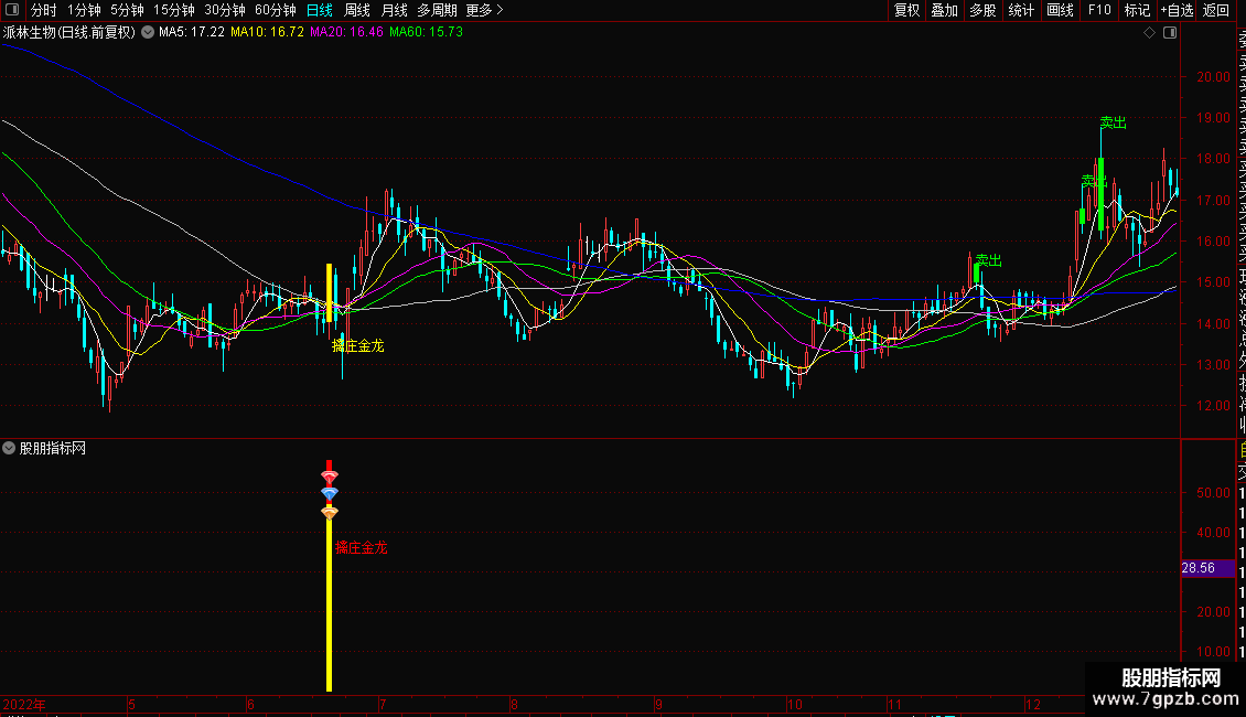 满足均线多头且MACD零轴上红柱递增同时单日涨幅超过6个点时回踩短期均线,且不破,此时提示擒庄金龙信号,信号经过了10日过滤避免多次重复出现。 价格进入超买区间RSI值小于下穿 84,此时标卖出信号,提示回调风险,及时止盈离场。