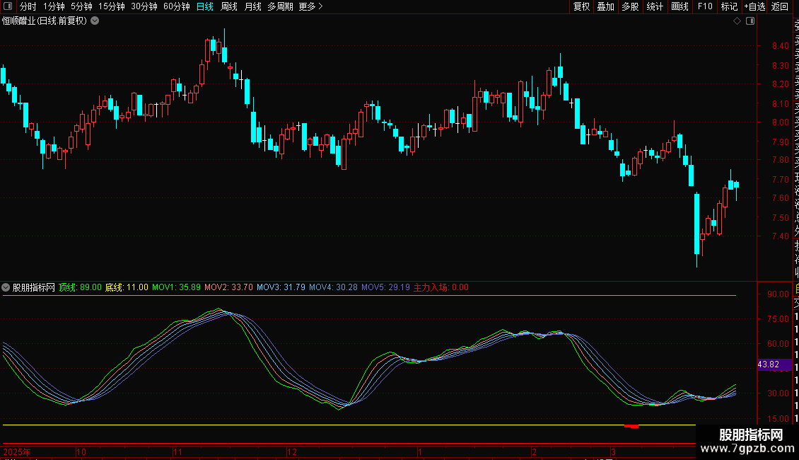 输出MOV2:MOV1的3日指数移动平均,画淡红色,线宽为1