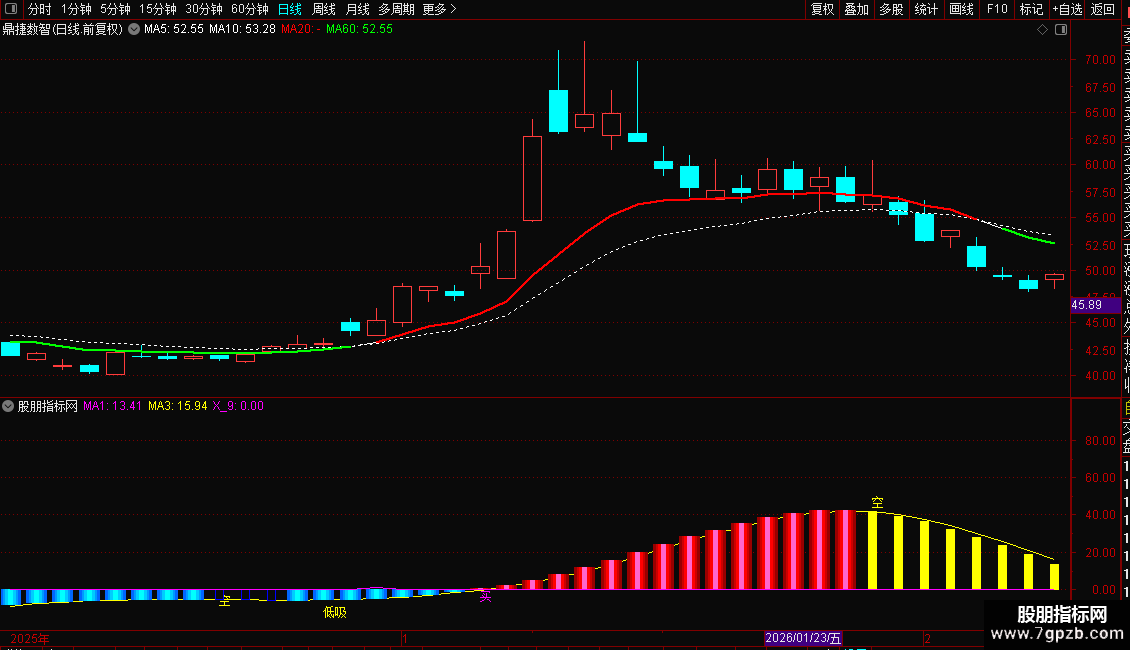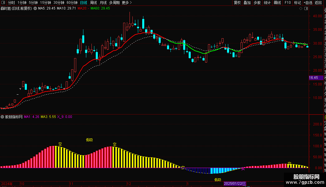 副图通过“主力动向”与MA1/MA3交叉信号,识别主力动向及“低吸”“买”时机,搭配RSI超买预警。