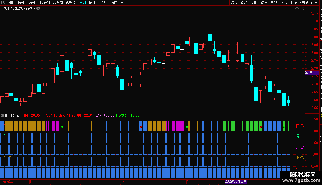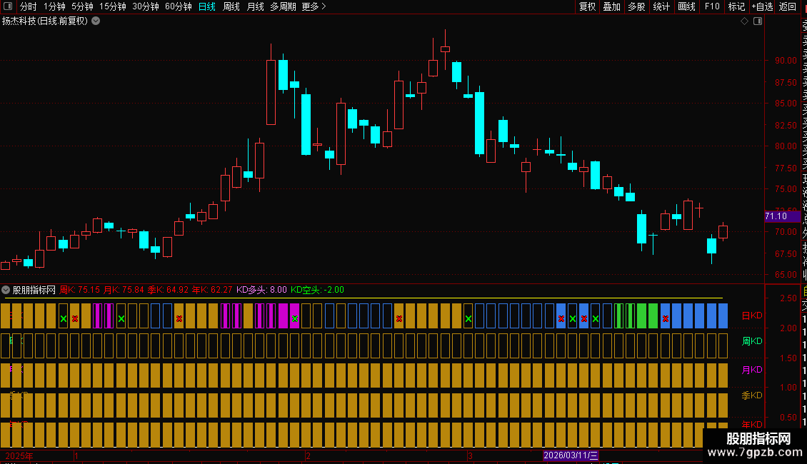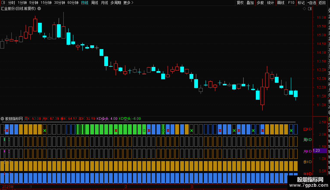 是一款实用的副图指标,专门用于多周期KDJ指标的同图展示。该指标不含未来函数,其独特之处在于能够将日、周、月、季等多个周期的KDJ指标整合在同一副图窗口中,大幅提升看盘效率,帮助投资者更直观地把握多周期共振买点,捕捉潜在强势股。需要留意的是,由于该指标使用了引用函数,目前仅支持电脑版通达信等软件使用,手机版无法安装。