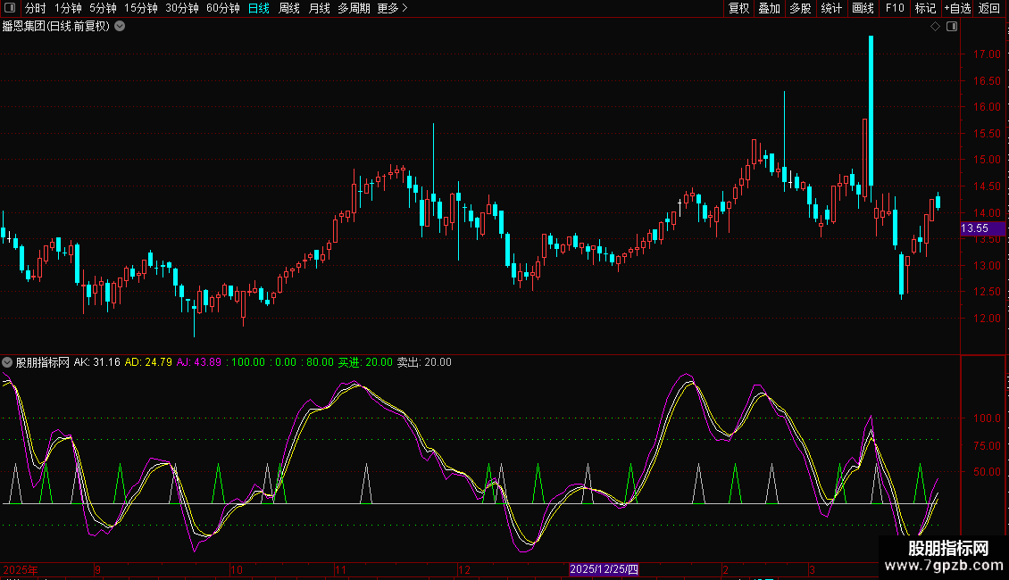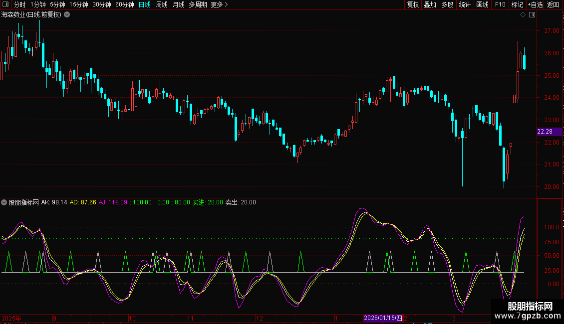 1. AK线(快线):核心信号线,对价格波动进行标准化和多重平滑处理后的结果,反应灵敏。