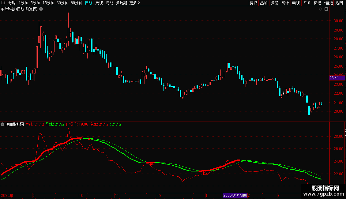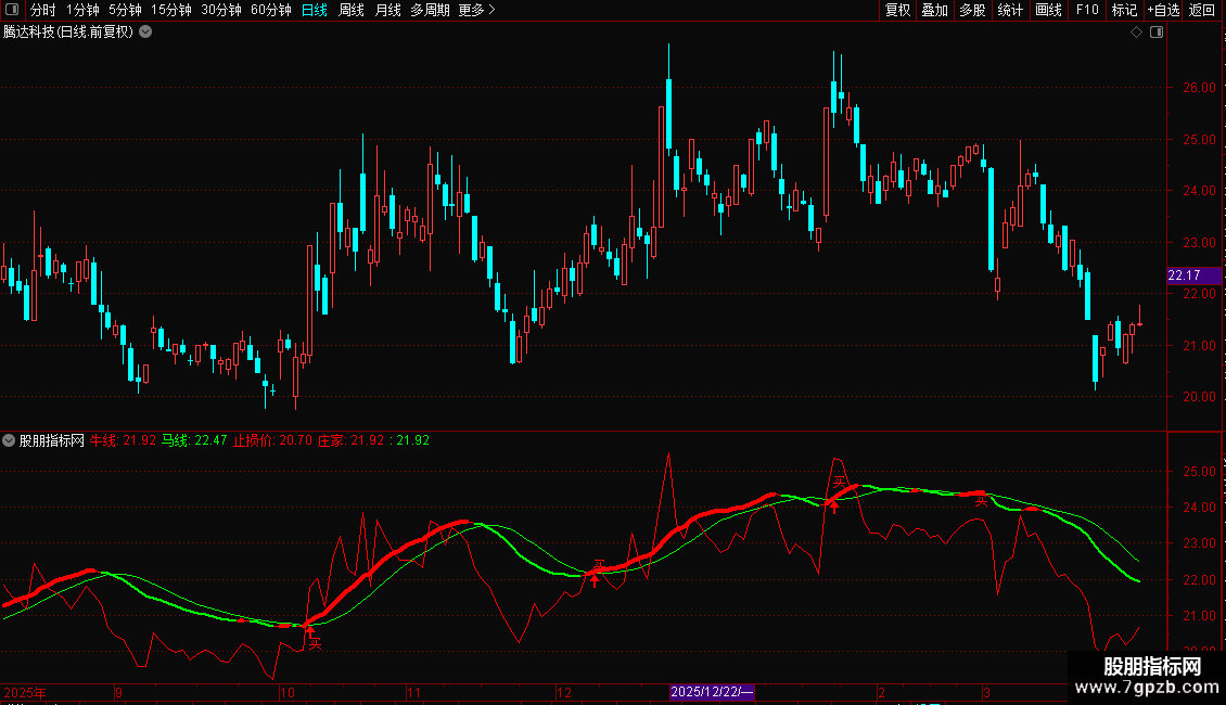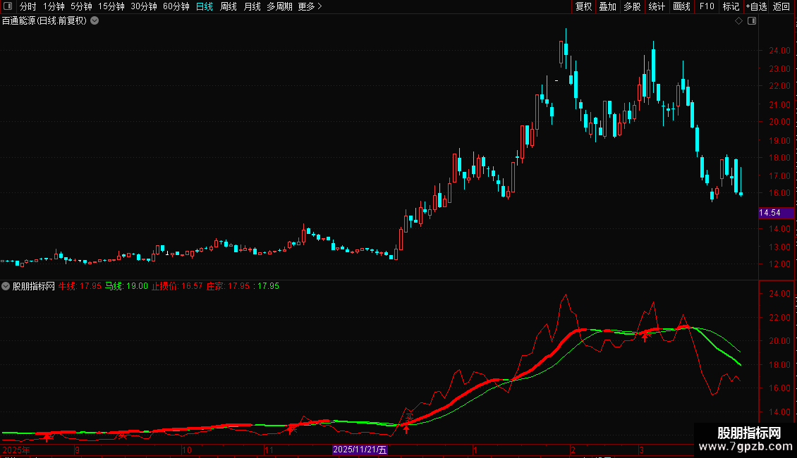 5. 庄家线:其计算与牛线完全相同,但通过颜色和粗细变化直观显示其涨跌:上涨时用红色粗线标示,下跌时用绿色细线标示。