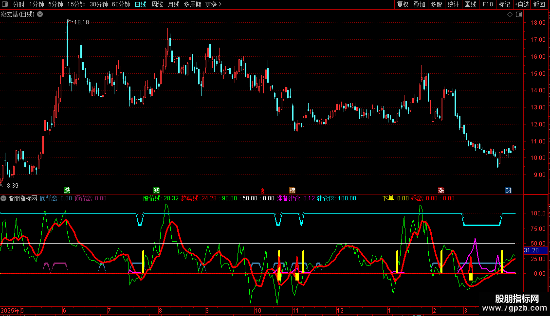 底背离:IF(MN< -4 ,17,0),COLORA67D3D,LINETHICK3;