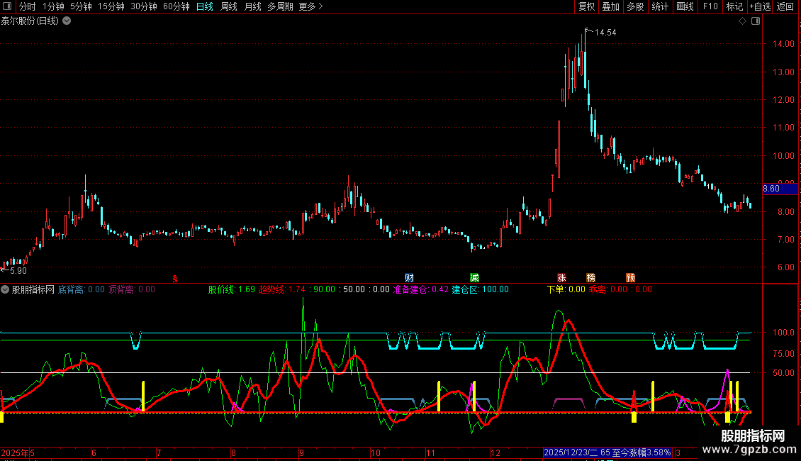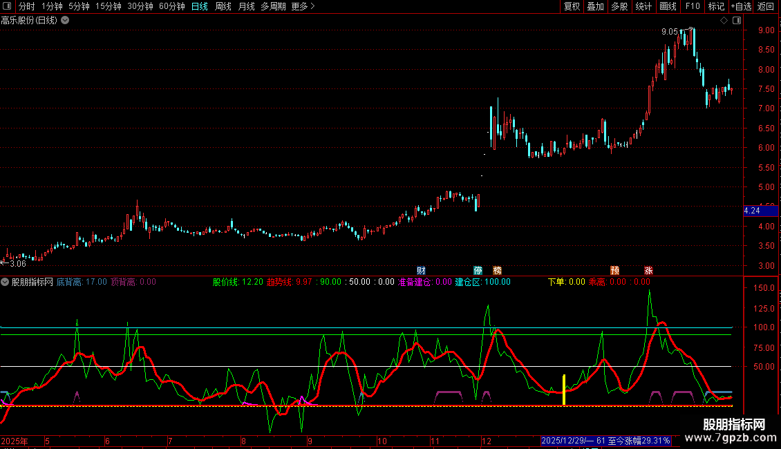 顶背离: IF((VAR26>90),17,0), COLOR6B238E,LINETHICK3;
