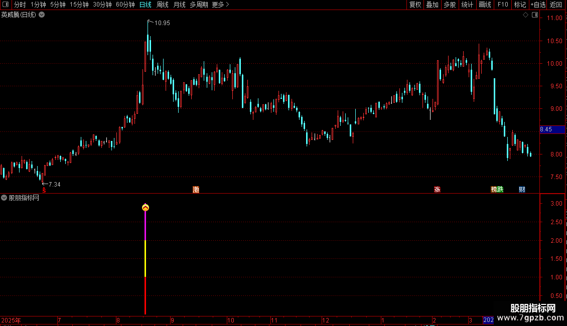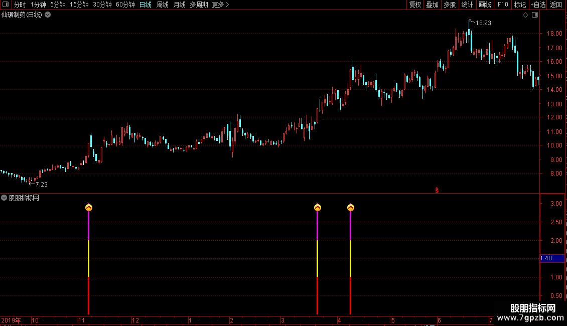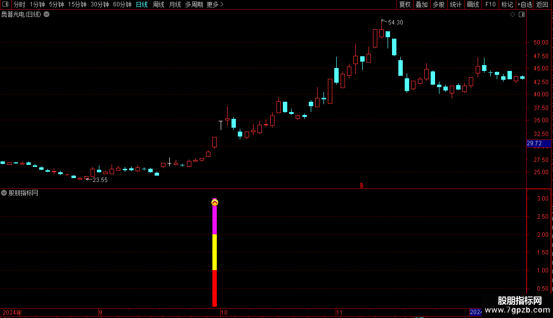 信号识别:当副图出现红黄相间的柱状线或特定图标时,即为选股信号。