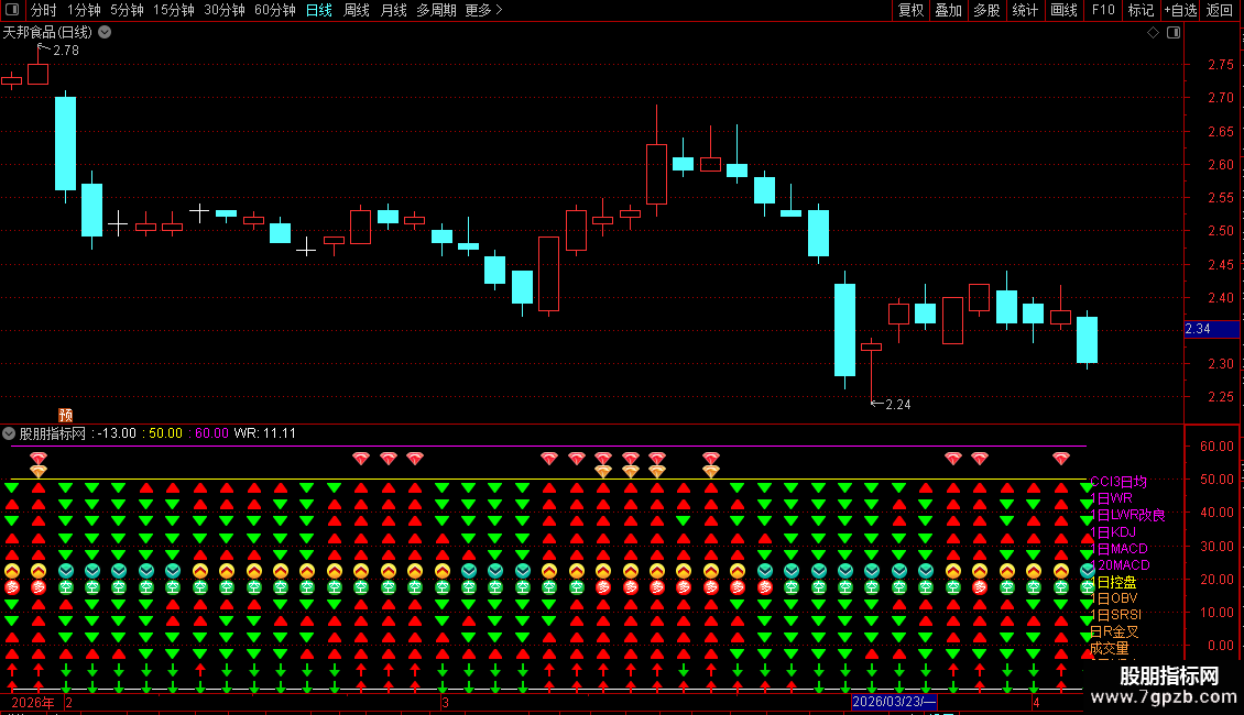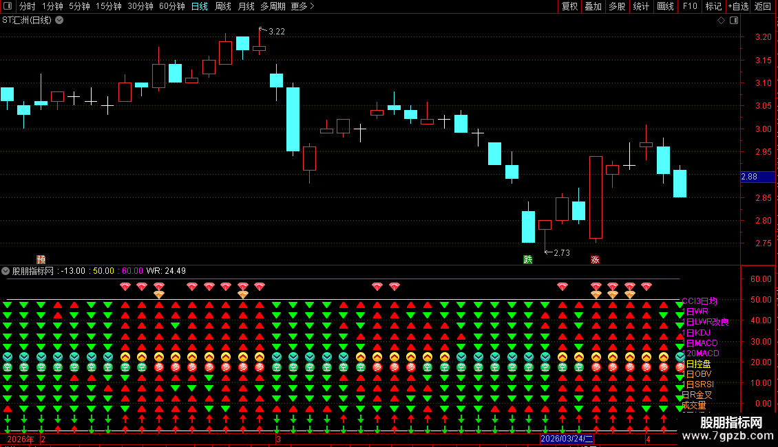 基础共振层:实时监测日线级CCI3日均、WR2日、MACD等6大指标趋势方向,通过箭头图标直观呈现多空状态;