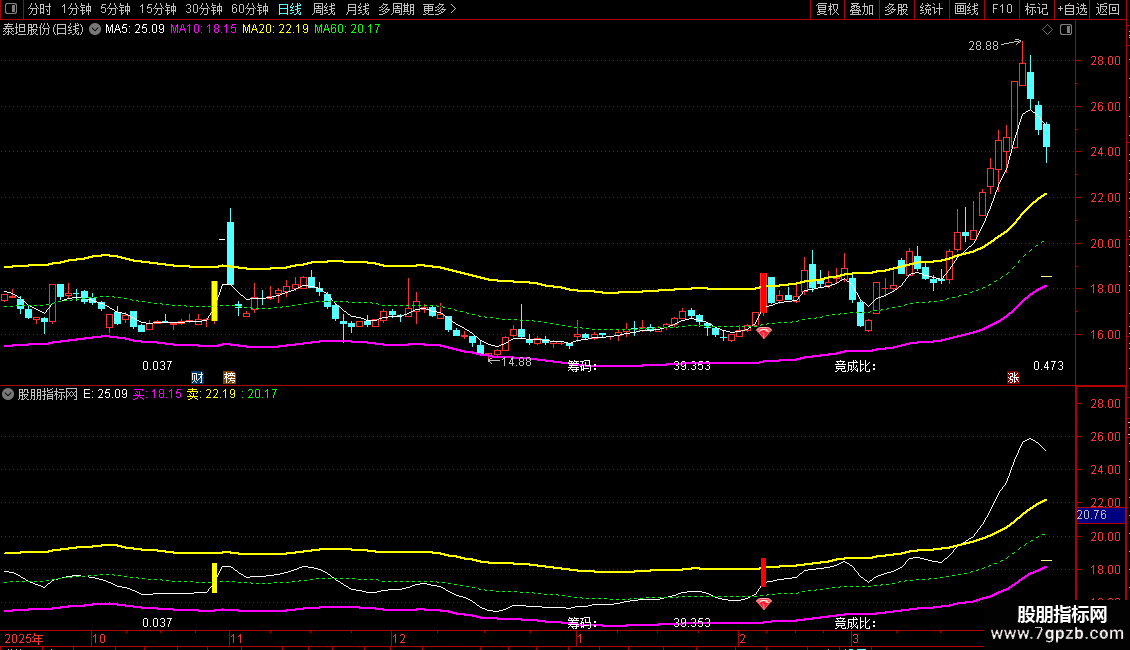 2. 股价回踩粉色买线企稳为低吸机会,突破黄色卖线且收涨停(红色K线+图标)为妖股加速信号;