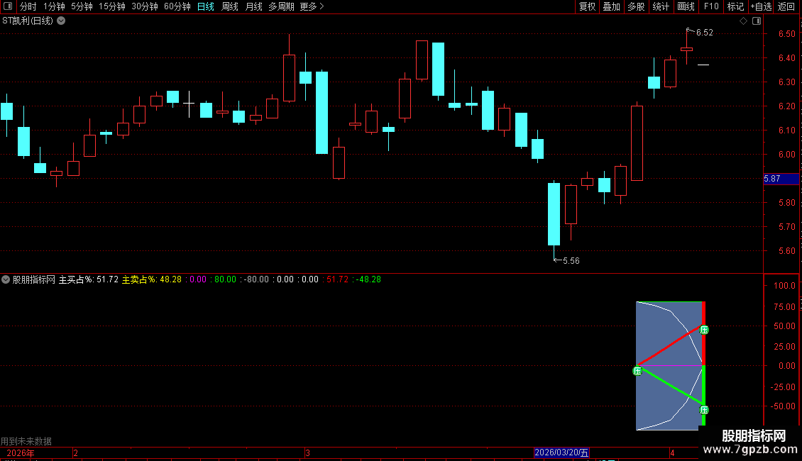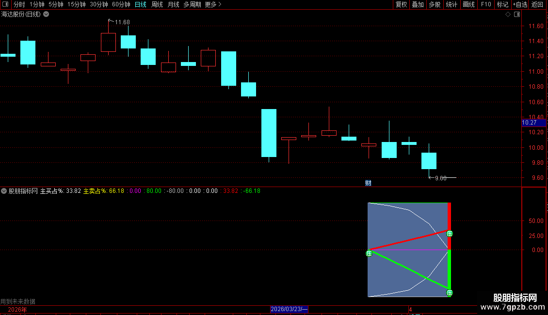 这是一个用于分析个股分时图中主力资金流向的指标。它通过计算主动买入和主动卖出的成交量占比,并以图形化的方式在分时图下方展示。